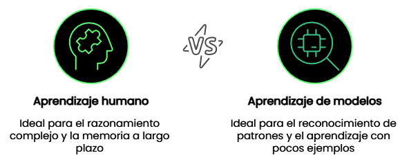 - Aprendizaje con pocos ejemplos: Los humanos aprenden de 1-2 casos, mientras que los modelos requieren millones de ejemplos.