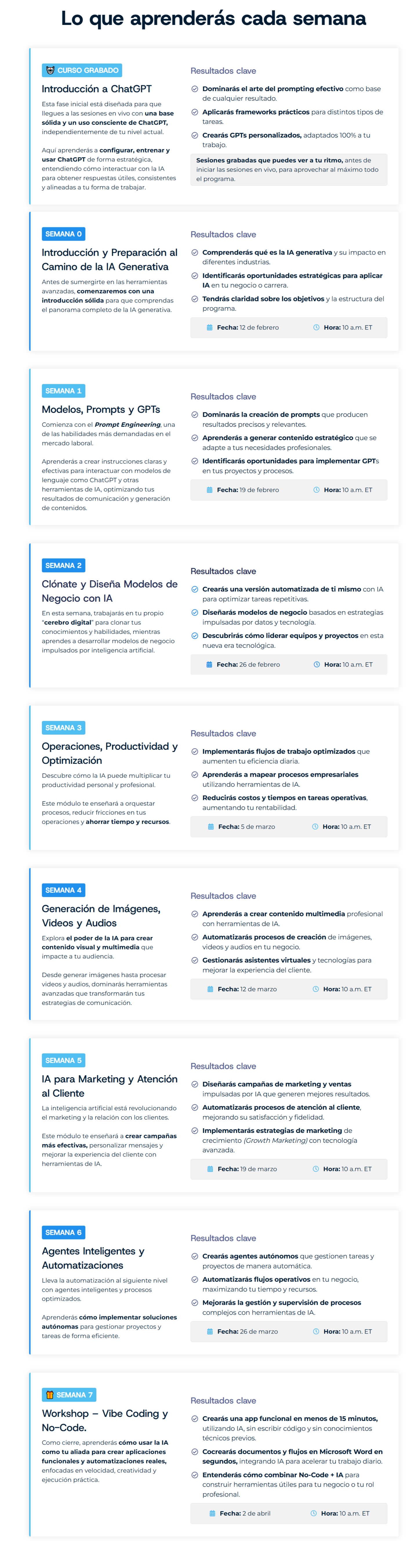• 8 semanas en vivo donde construyes sistemas reales, no solo aprendes conceptos.