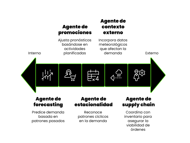 • Y un agente de analítica proyecta métricas esperadas.