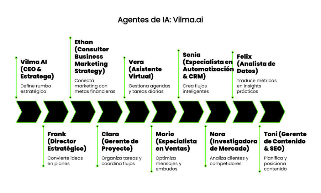 De hecho, plataformas como Vilma.ai han construido ecosistemas completos de agentes especializados que funcionan como verdaderas agencias de marketing digital, disponibles 24/7.