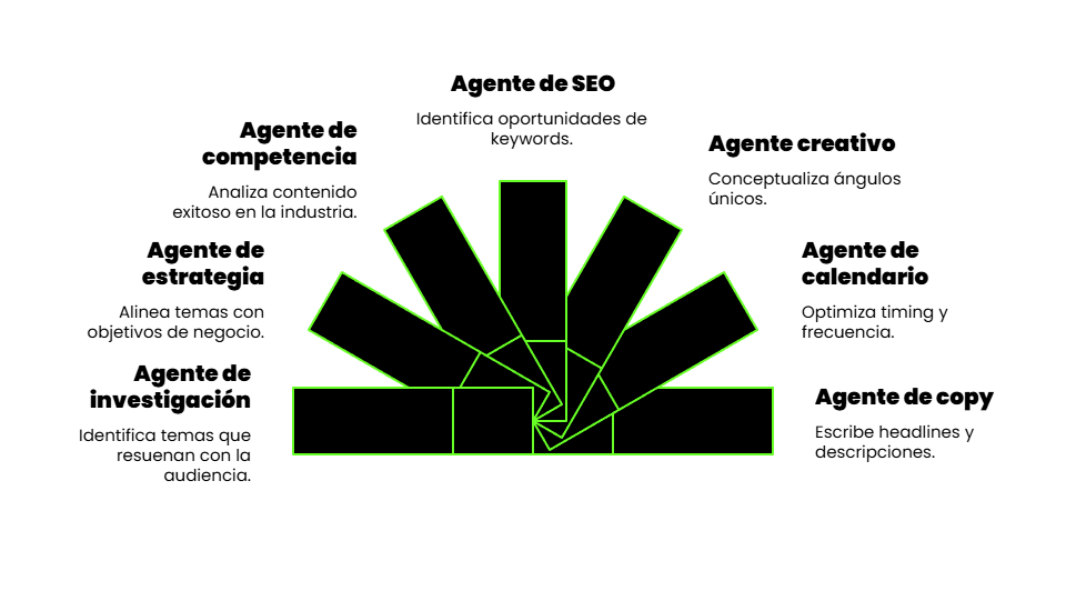 No es una IA respondiendo prompts. Es un equipo de expertos trabajando juntos, como en una agencia real.
