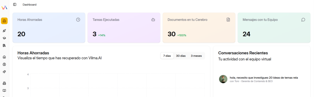 Mide horas ahorradas, tareas ejecutadas, documentos creados y conversaciones con tu equipo virtual. Un panel claro para ver el impacto real de tu marketing con IA.