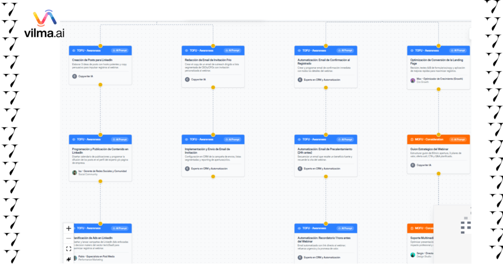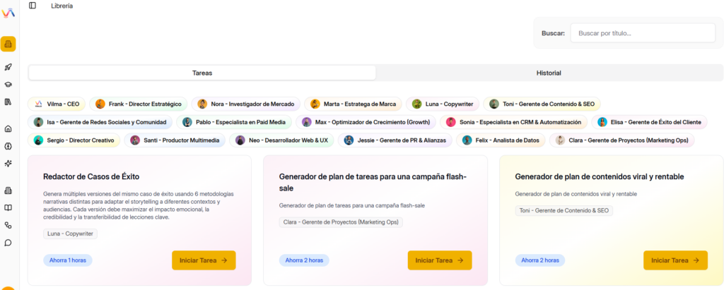 Dentro de Vilma.ai tienes más de 15 empleados especializados para planificar, crear y optimizar tu marketing contigo, 24/7, sin nóminas ni reuniones: