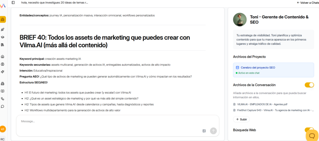 Con toda esa información, Vilma.ai piensa y ejecuta con tu mismo contexto. Cuanto más contexto le das, más inteligentes y alineados serán los resultados.