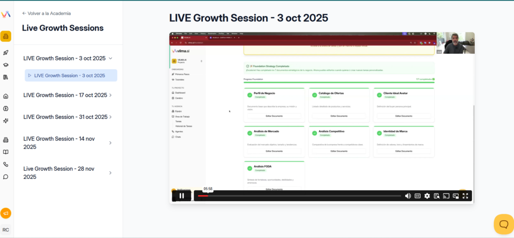 Cada 15 días nos reunimos en vivo para ayudarte a aplicar nuevas estrategias de marketing y negocio dentro de Vilma.ai.