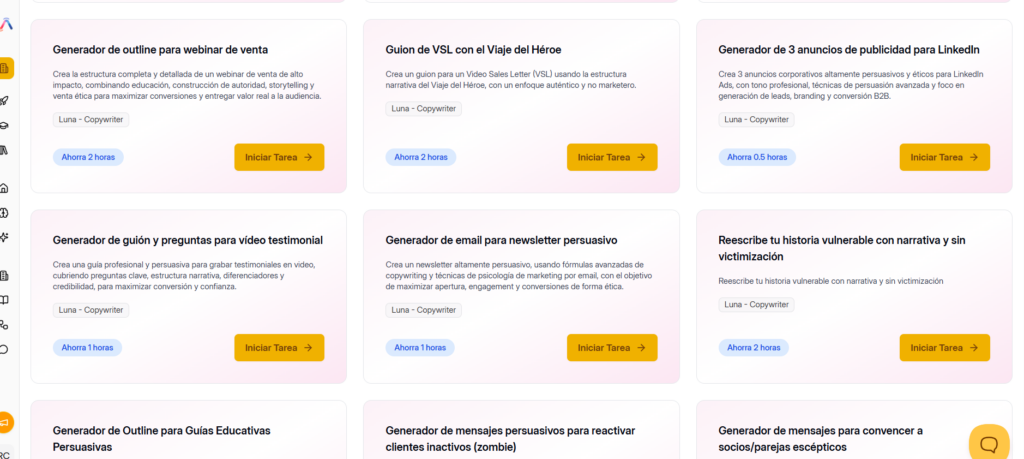 Accedes a más de 350 tareas inteligentes de marketing y negocio para ejecutar con un clic. Cada tarea que antes requería horas de planificación, ejecución y revisión, ahora se resuelve en minutos, con la precisión de un equipo experto y la velocidad de la IA.
