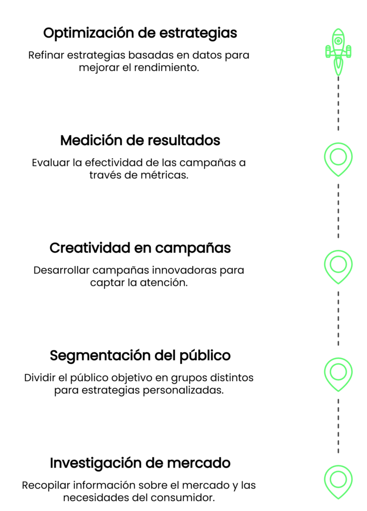 - Proponer ángulos creativos para campañas según insights de datos que revelan patrones de comportamiento.